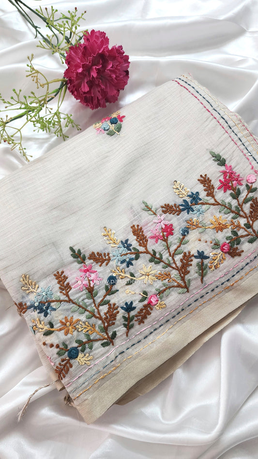 Soft linen tissue silk saree with hand embroidery | Off- white | LTS1