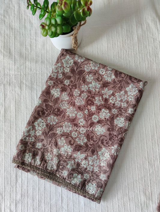 Eyelet fabric with embroidery and lace edges unstitched salwar set | Brown | H8