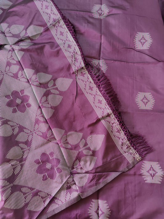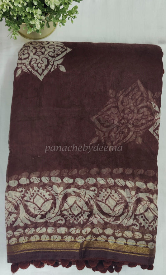 Cotton blend saree with batik print design and pom pom borders | Brown | PA109