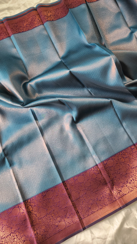 Copper zari woven semi kancheevaram saree with contrast border and blouse | Peacock blue with purple border | SS124