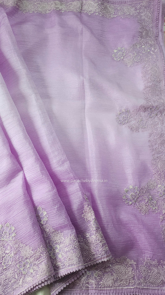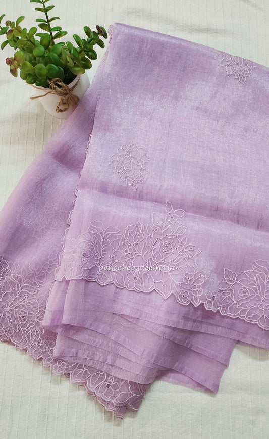 Organza glass tissue saree with embroidery and cutwork with scalloped borders(Available on Prebooking please whatsapp 8296837556) | Lavender |GL3