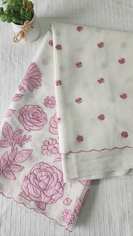 Kota applique saree with scalloped borders | white with pink flowers | KAP6