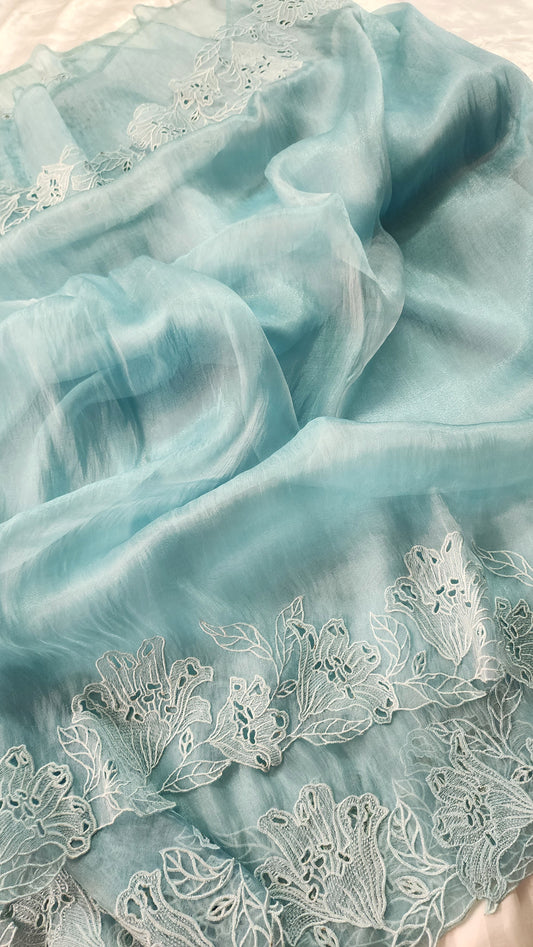 Organza glass tissue saree with embroidery and cutwork borders | Blue |GL1