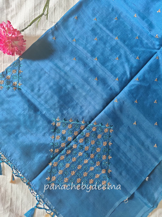 Semi raw silk designer saree with cut work borders and embroidery | Teal blue | DY4