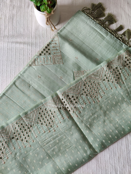 Beautiful semi tussar saree cut work border | Pastel green | CT114