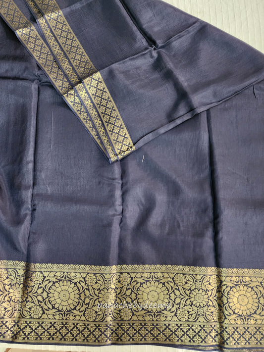 Semi banarasi munga silk designer sareee with plain body and zari weaving borders. Comes with contrast brocade blouse | Navy blue with pink | BS4
