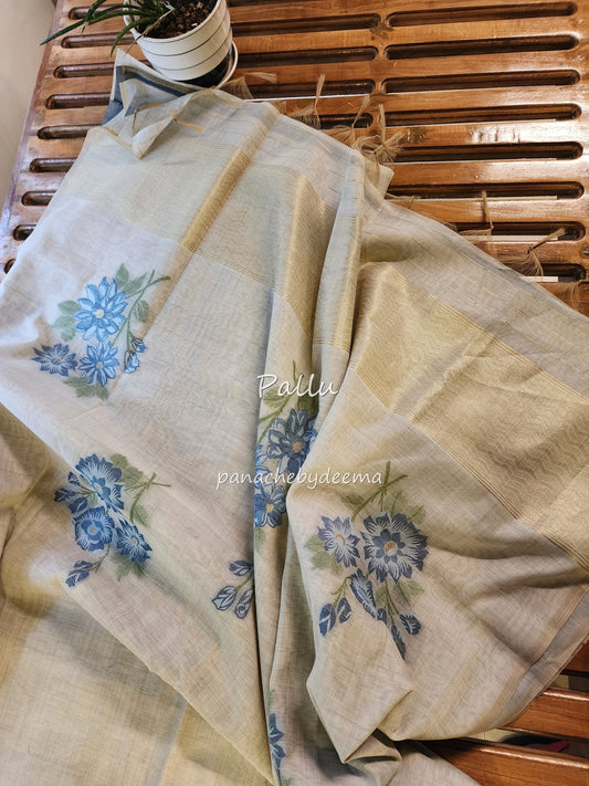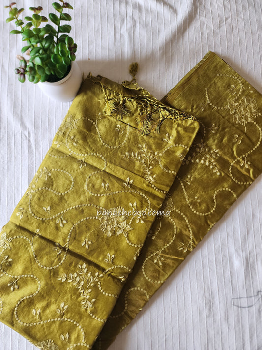 Semi matka silk saree with embroidery | Yellowish green | A2