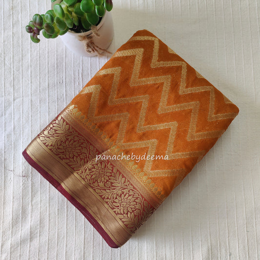 Semi-banarasi georgette saree with golden zari weaving | Mustard yellow with maroon borders |GS2