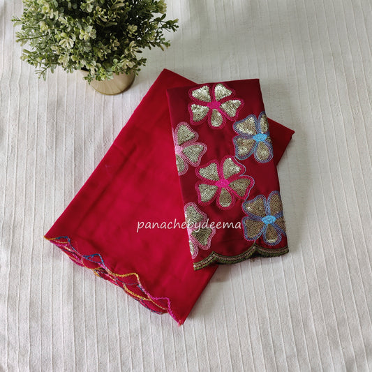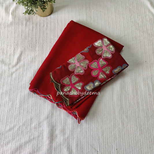 Beautiful georgette plain saree with scalloped borders, comes with heavy embroidery and sequins work blouse| Chilli red|S6