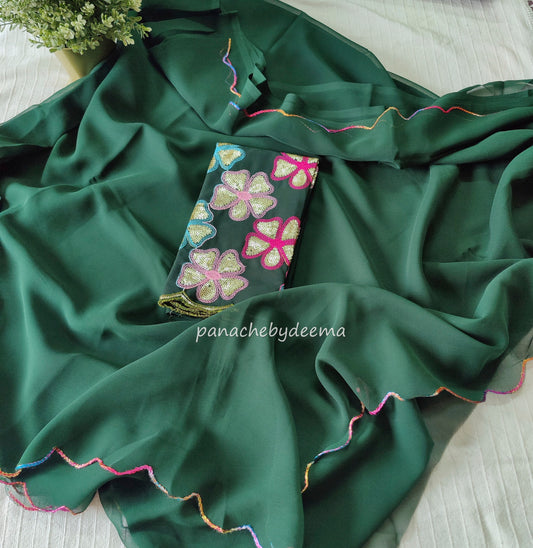 Beautiful georgette plain saree with scalloped borders, comes with heavy embroidery and sequins work blouse| Green|S4
