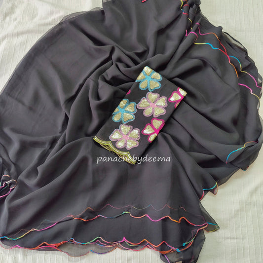 Beautiful georgette plain saree with scalloped borders, comes with heavy embroidery and sequins work blouse| Black |S1