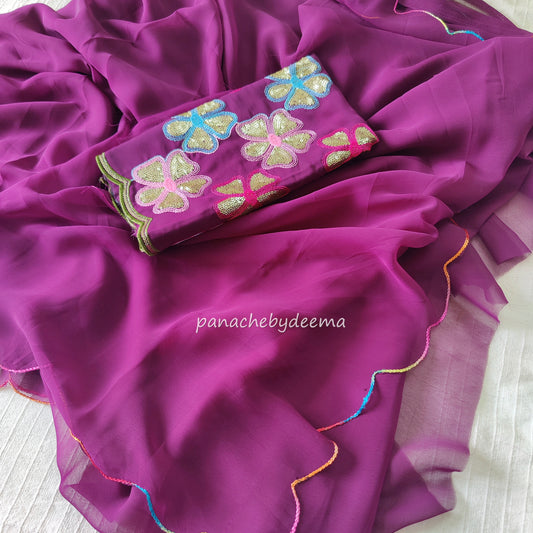 Beautiful georgette plain saree with scalloped borders, comes with heavy embroidery and sequins work blouse| Purple |S3