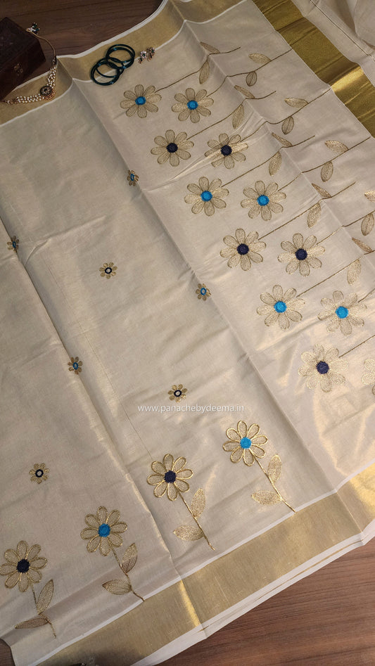 Golden tissue kerala saree with flower embroidery | Navy blue and seablue ON102