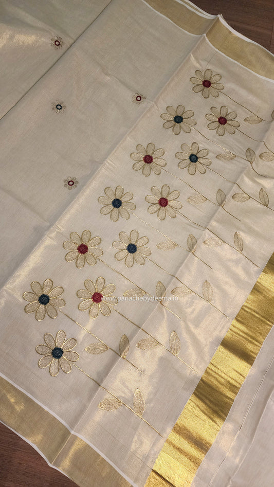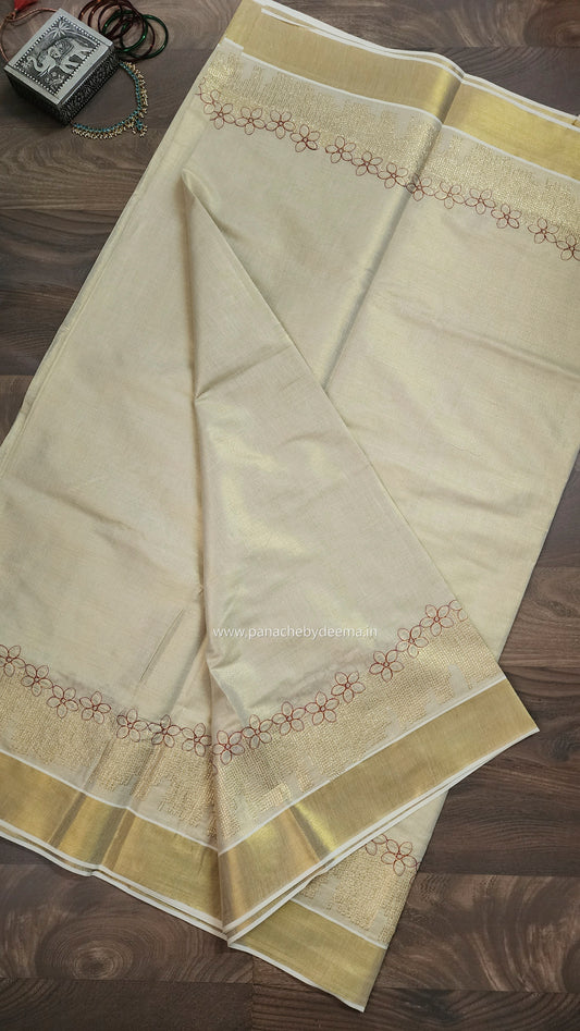 Golden tissue kerala saree with flower embroidery |Red and green ON103