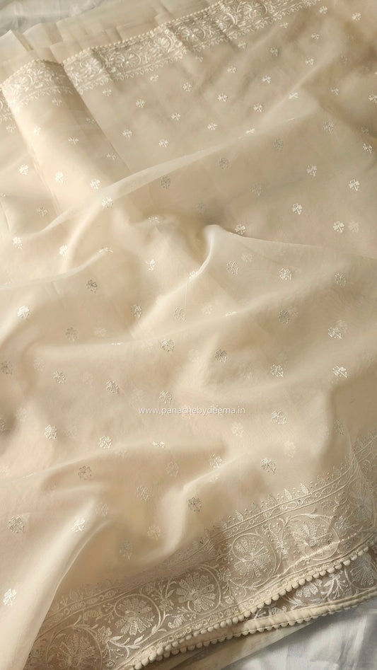 Organza saree with digital print kantha embroidery and lace edges | Offwhite| ODG1