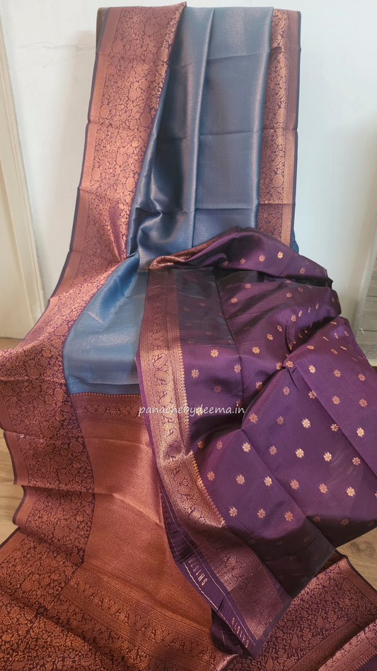 Copper zari woven semi kancheevaram saree with contrast border and blouse | Peacock blue with purple border | SS124