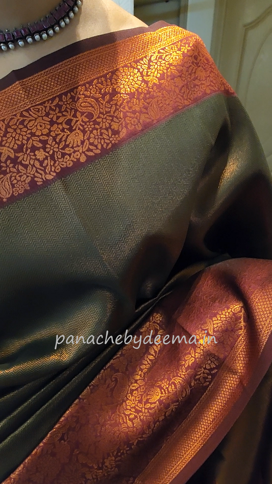 Copper zari woven semi kancheepuram silk saree with contrast border and blouse | Green with maroon border |SS125