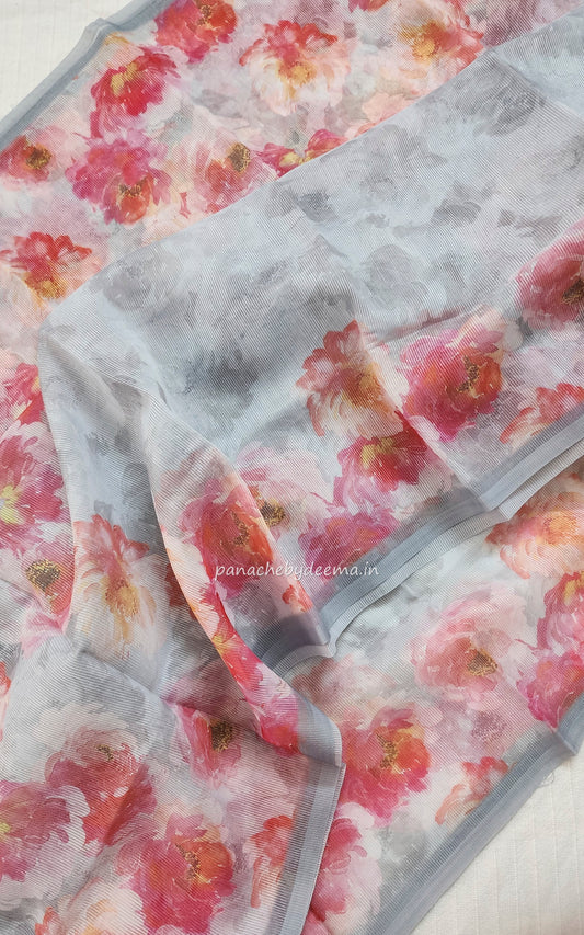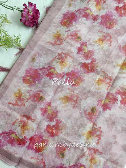 Semi net kota silk digital print saree with golden borders | Beige |K4