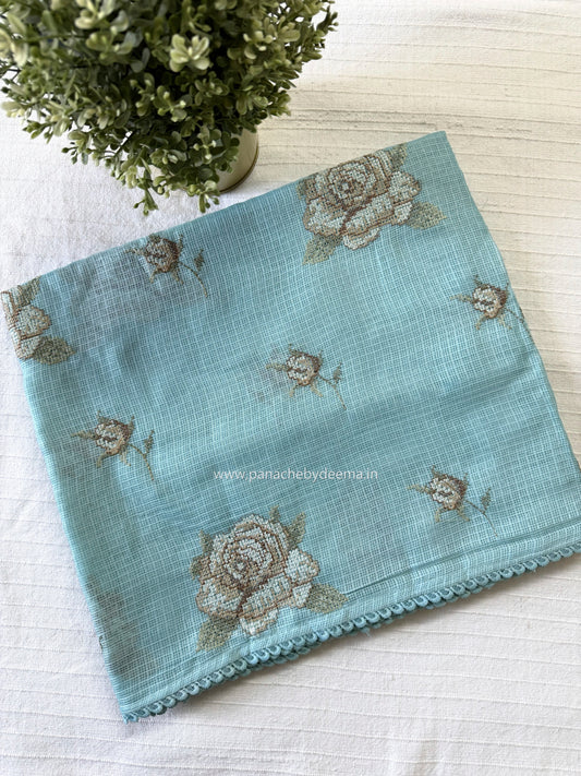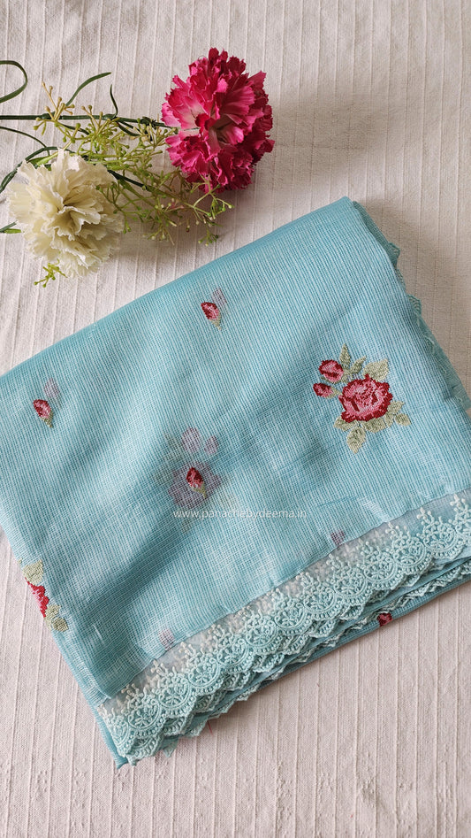 Silky Kota saree with cross stitch embroidery and lace detailed borders|Ice blue|SL3