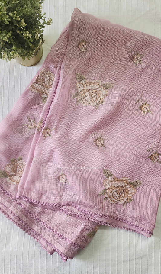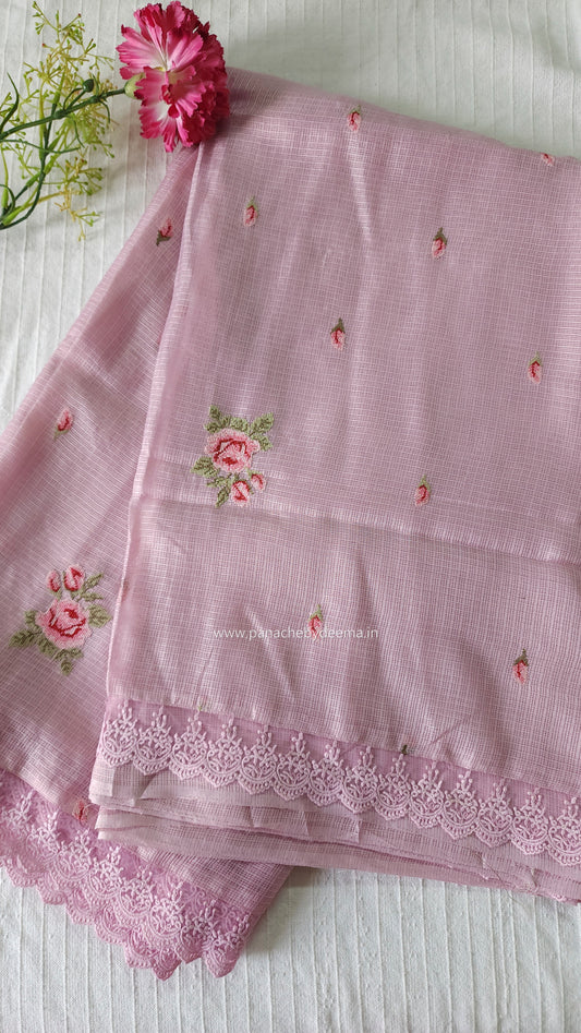 Silky Kota saree with cross stitch embroidery and lace detailed borders|Pink |SL7