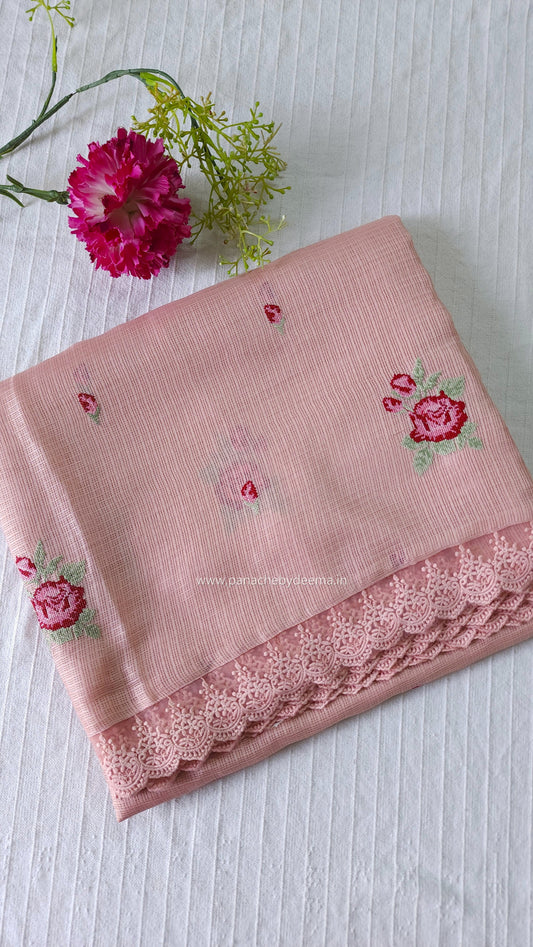 Silky Kota saree with cross stitch embroidery and lace detailed borders|Peach |SL6