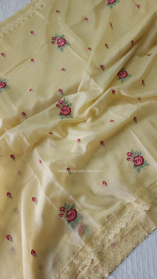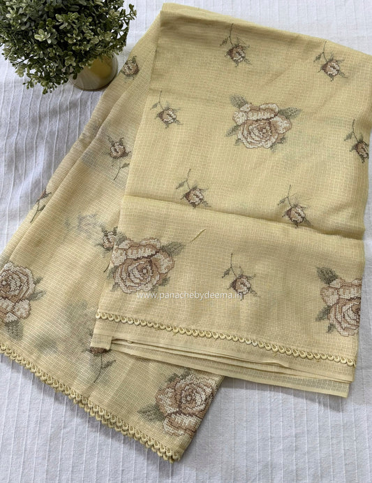 Silky Kota saree with cross stitch embroidery and lace detailed borders|yellow|SL10