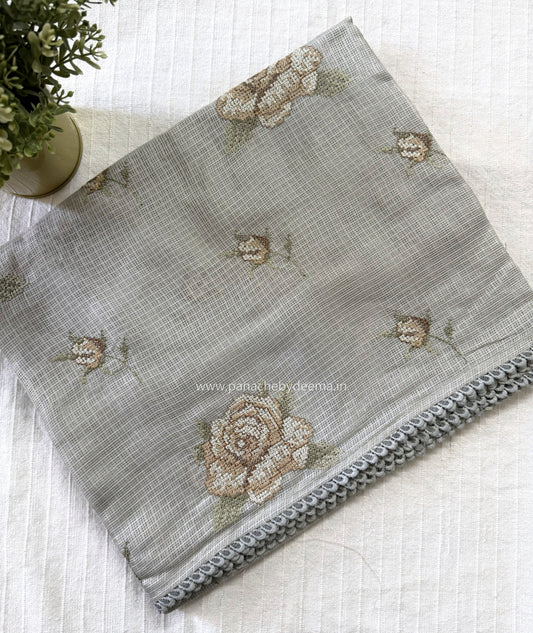 Silky Kota saree with cross stitch embroidery and lace detailed borders|Grey|SL9