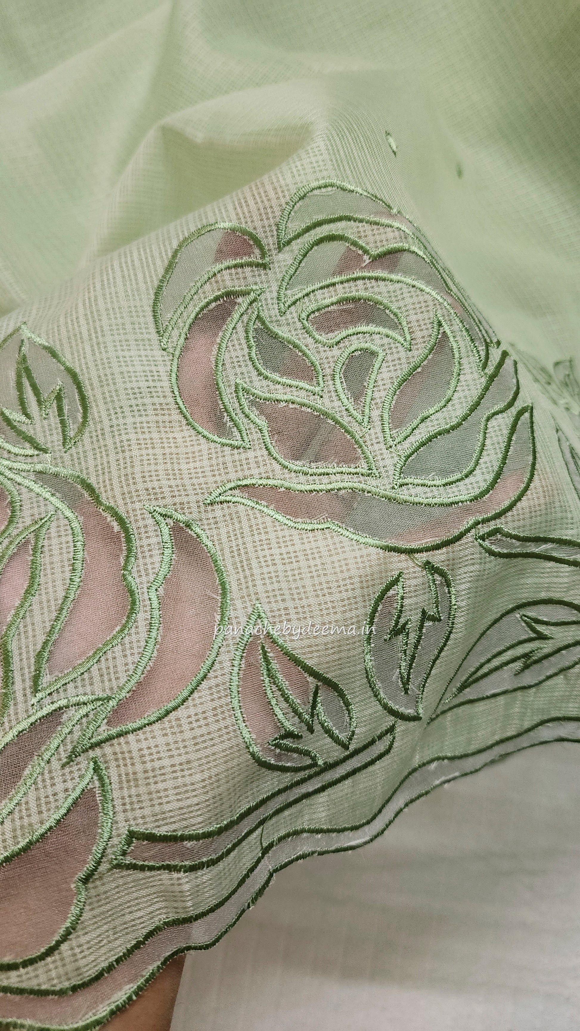 Kota applique saree with scalloped borders. Comes with running plain blouse