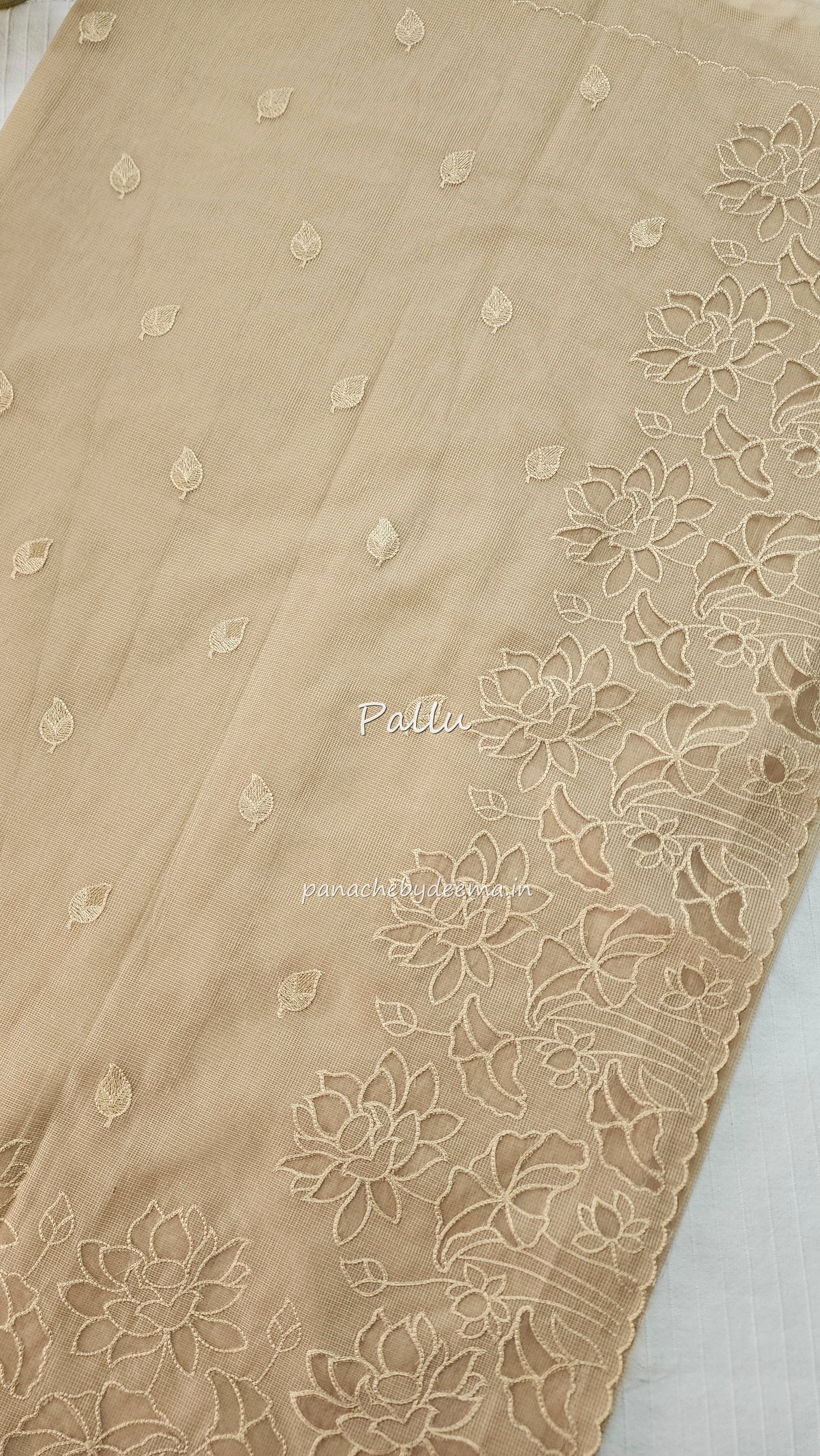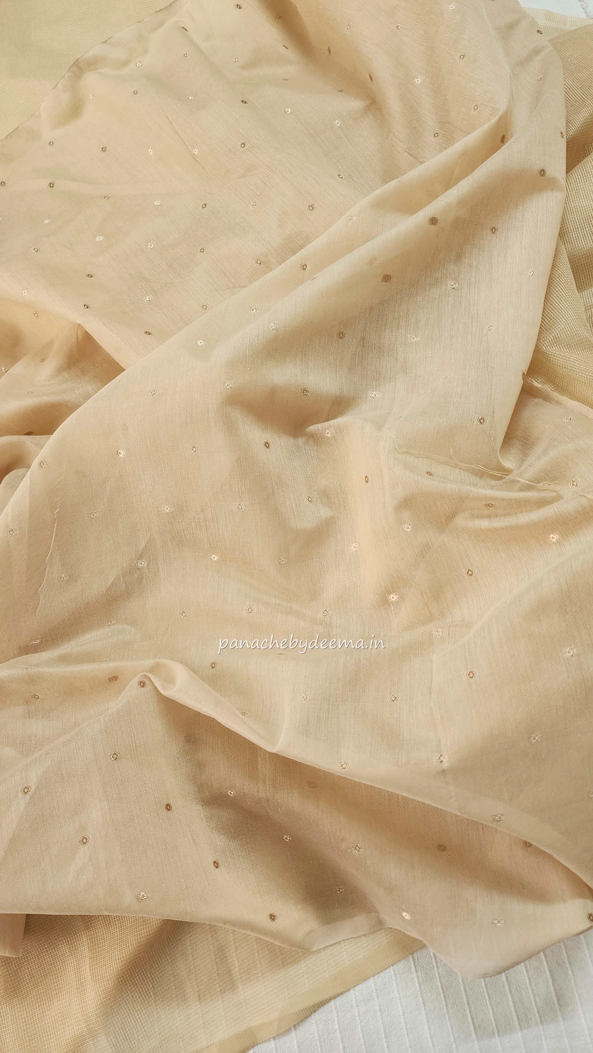 Sand-colored Kota saree featuring intricate appliqué work and beautifully scalloped borders. Small butta embroidery is scattered over the front portion snad on the lower panel of the saree. The appliqué work is focused on the lower part of the saree, giving it a graceful highlight. Incredibly lightweight and airy, this saree blends traditional elegance with modern appeal. It comes with a Chanderi blouse featuring rosegold butta weaving.