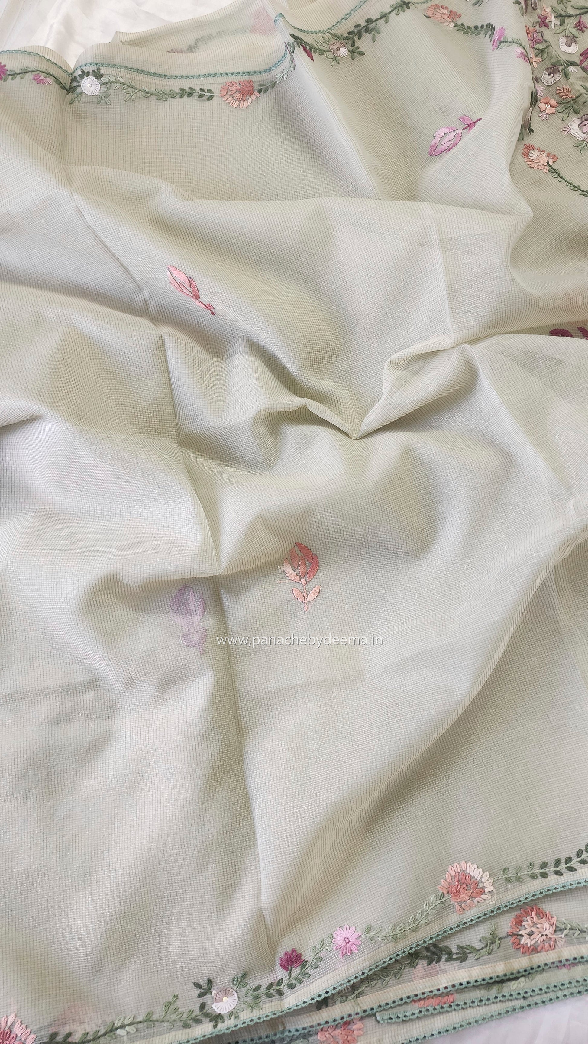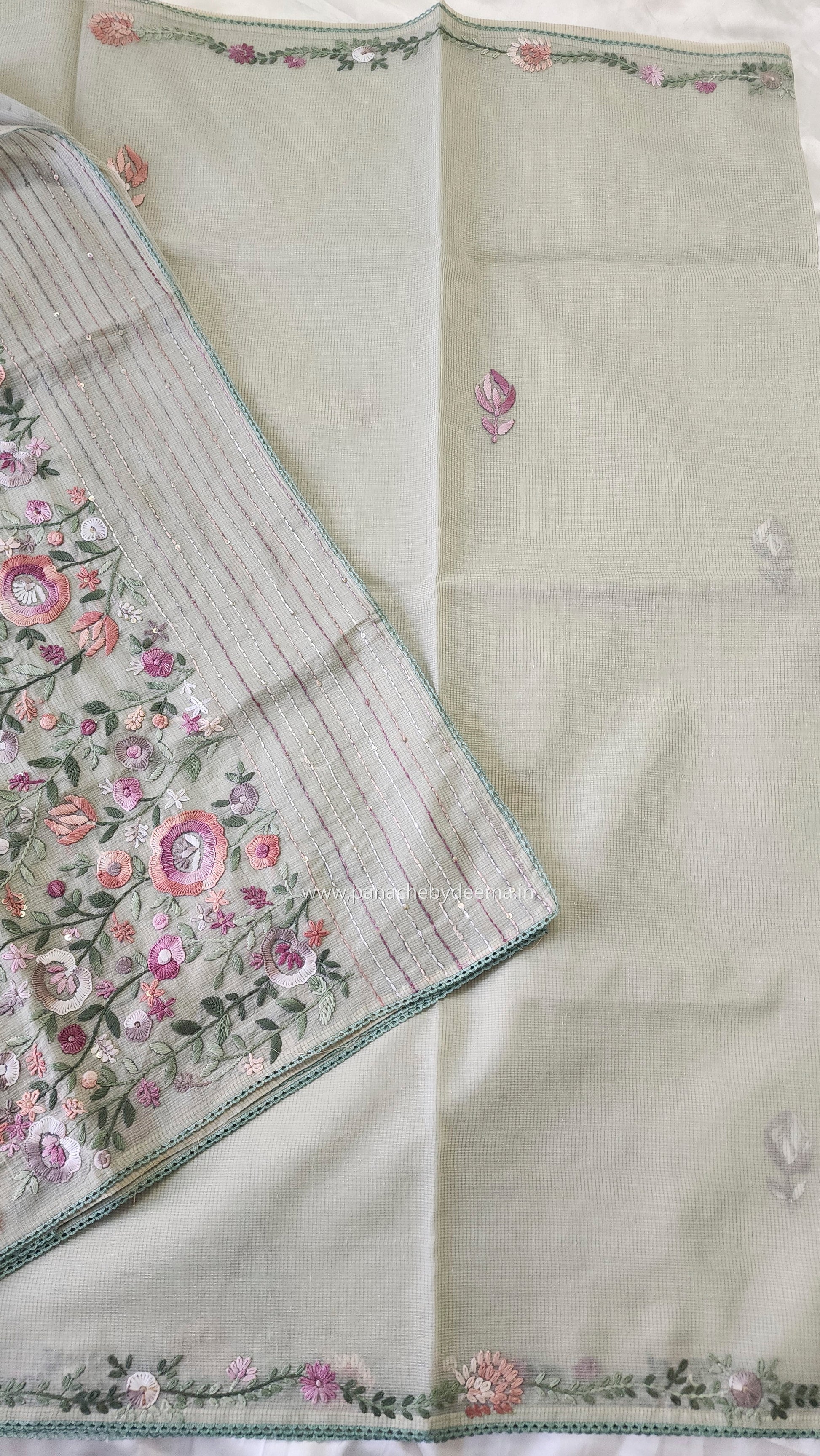 Linen kota saree with hand embroidery and lace edges | Green | LK4