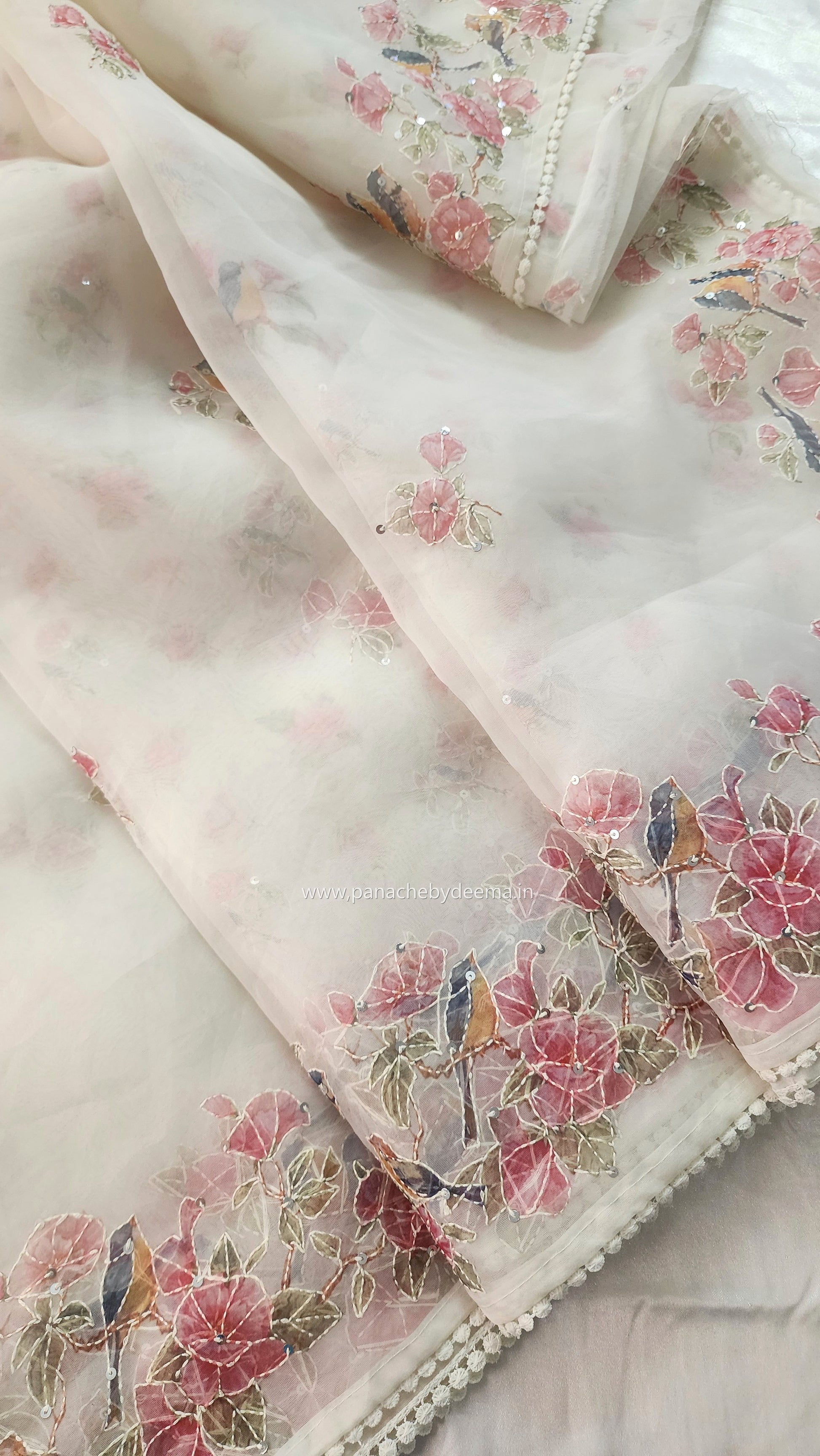 Off-white organza saree with elegant floral and bird digital print motifs and delicate kantha stitches. Saree is finished with lace edges. Comes with running blouse with digital print