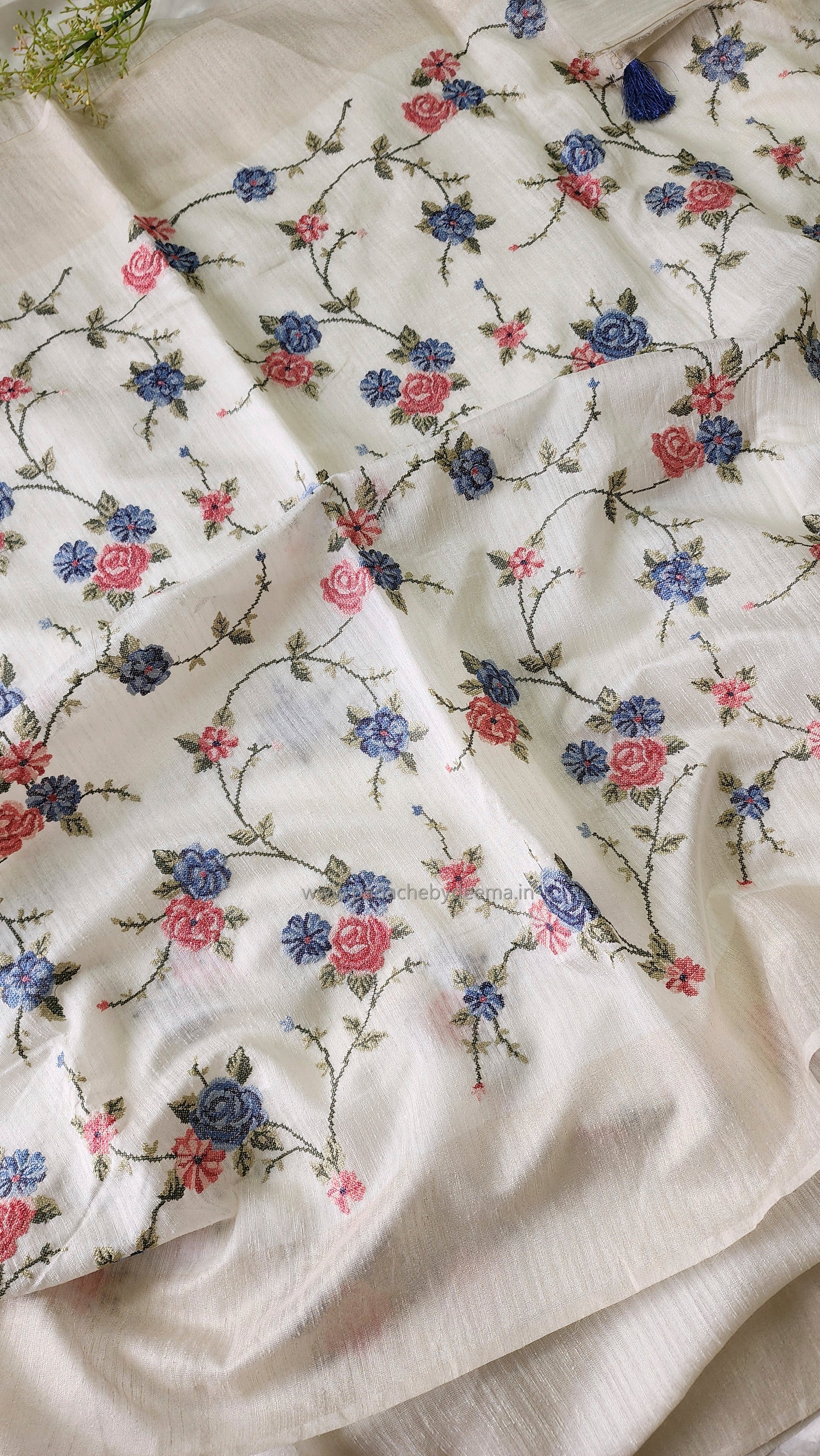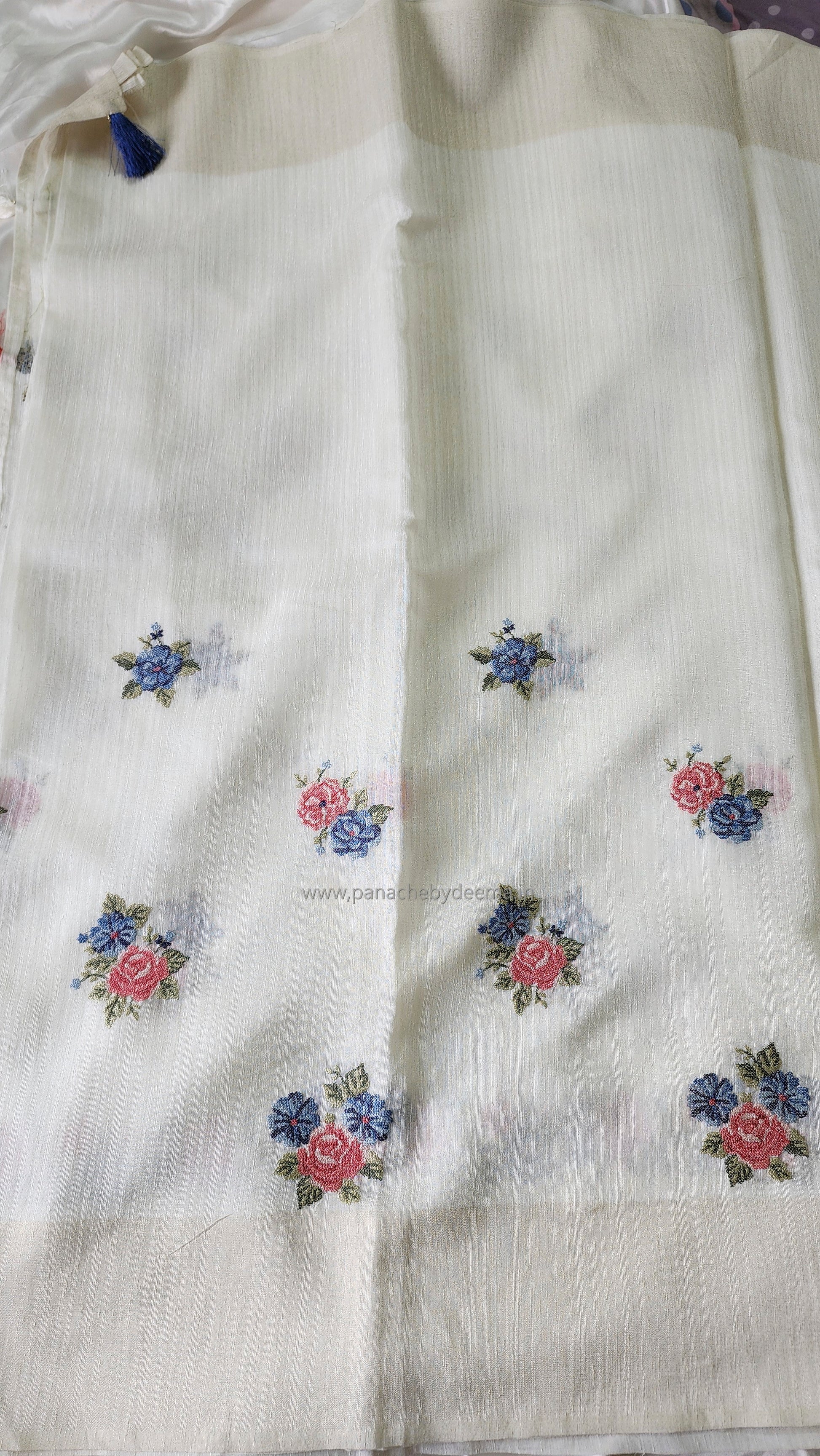 Semi jute silk saree featuring delicate floral cross-stitch embroidery — beautifully placed on the pallu, front, and lower panel.