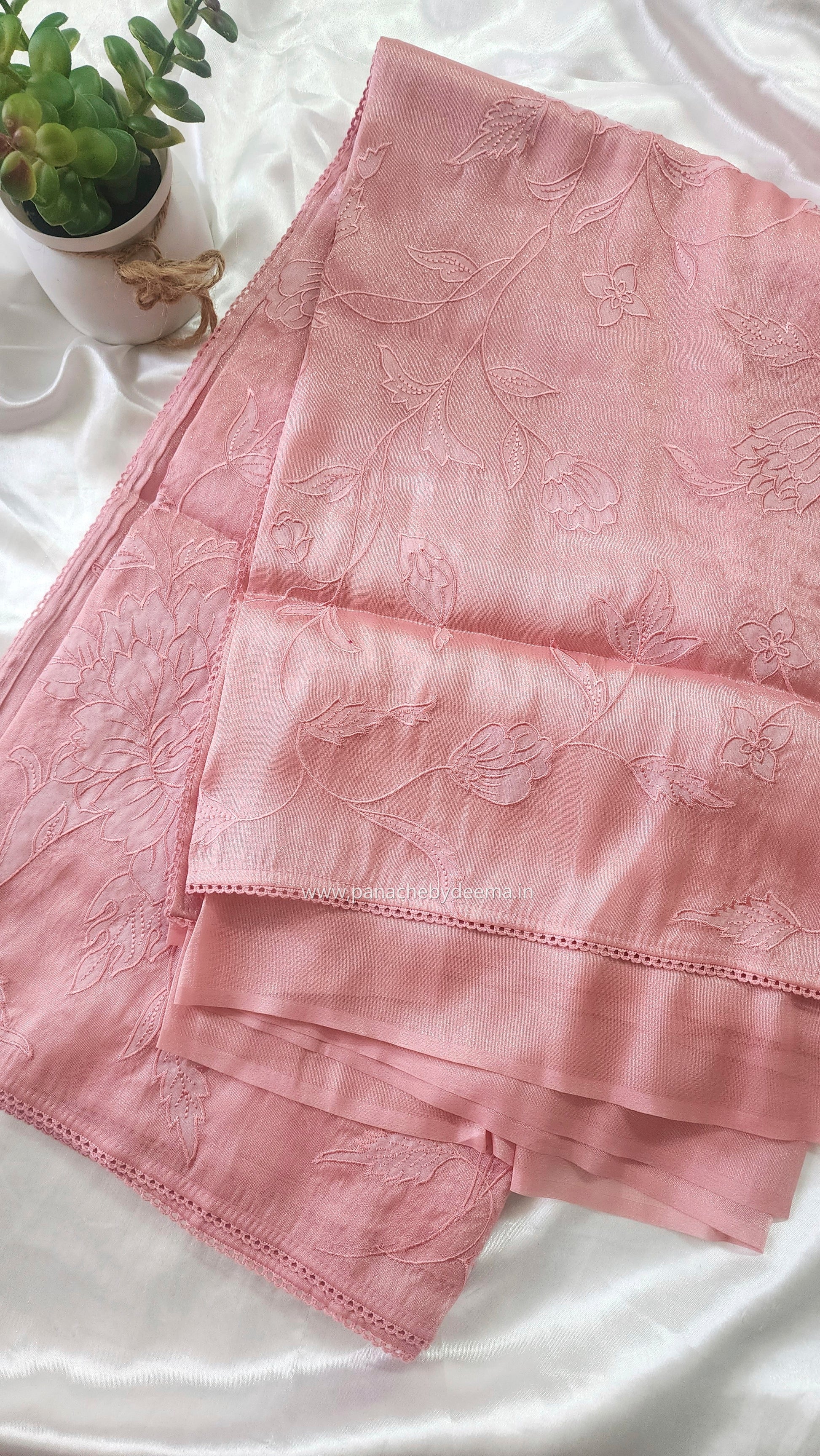 Soft chandaniya saree with applique work with lace borders. Comes with aplain running blouse with lace detailing on the sleeve edges. Applique and embroidery work is present on the front, pallu portion and towards the lower panel of the saree. Saree is soft with a gentle shimmer and is easy to drape